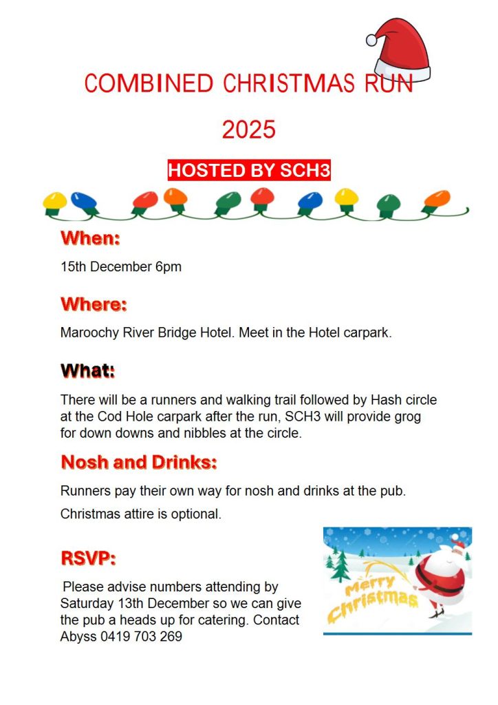 Run # 2376 Combined Clubs Xmas Bash Run # 2376 Combined Clubs Xmas Bash By Onsec | 16/11/2025 Run # 2376 Monday 15 December 2025 @ 6.00pm Combined Clubs Xmas Bash ( Hosted by SCH3 Hare: SCH3 Stripper Start: Maroochy River Bridge Hotel 22 Denna St Maroochydore. Meet in the Hotel carpark. Circle in Cod Hole Carpark Bradman Ave Maroochydore then On Inn: Maroochy Bridge Hotel as above Map Ref:Maroochy Bridge Hotel 22 Denna St Maroochydore Run Fee: no run fee but drinks from Noosa H3 bucket available. Food & grog in pub PAYG